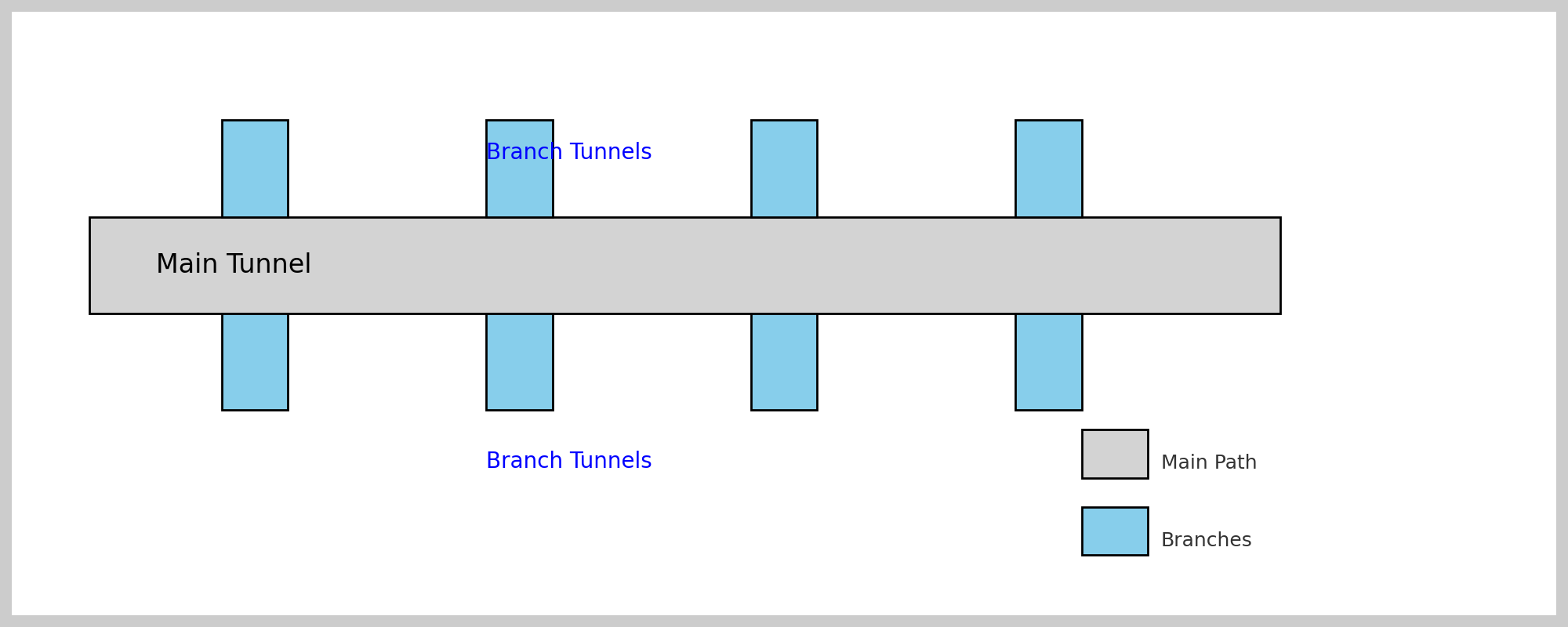 1๊ฐ์ ๋ฉ์ธ ํฐ๋์ ๋ซ๊ณ , ์ข์ฐ๋ก ์ผ์ ๊ฐ๊ฒฉ(2~3์นธ)์ผ๋ก ๊ฐ์ง ํฐ๋์ ๋ง๋ค์ด ์ฑ๊ตดํ๋ ๋ฐฉ์์