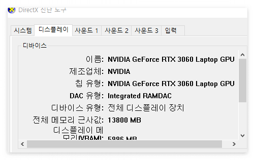dxdiag์ ๋ ฅ ํ ์คํ- ๋์คํ๋ ์ด(Display) ํญ ํด๋ฆญ