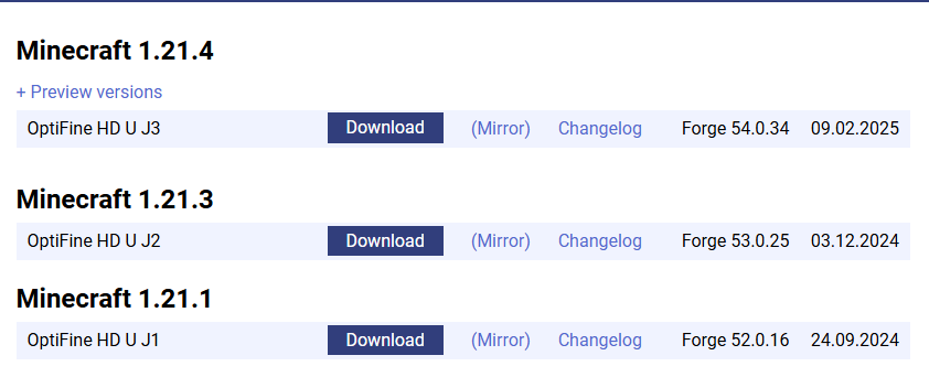 Minecraft 1.21.4 + Preview versions OptiFine HD U J4 pre2 Download (Mirror) Changelog Forge 54.1.0 20.02.2025 OptiFine HD U J4 pre1 Download (Mirror) Changelog Forge 54.1.0 18.02.2025 OptiFine HD U J3 Download (Mirror) Changelog Forge 54.0.34 09.02.2025 Sh
