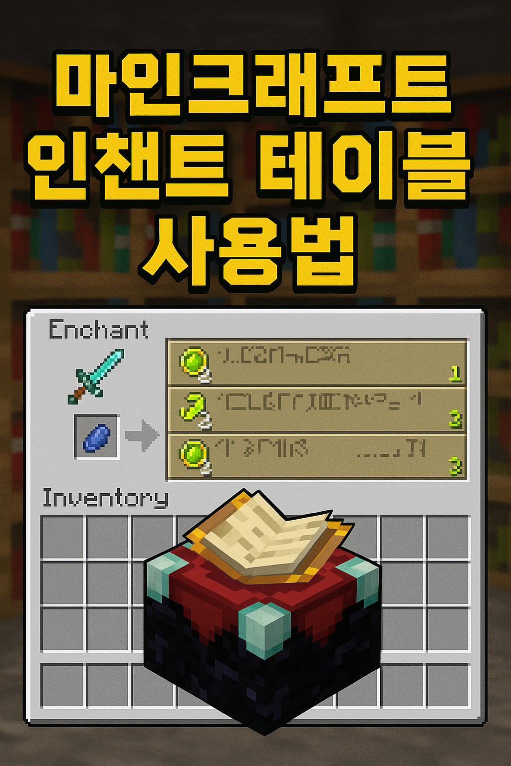 ์ธ์ฑํธ ํ ์ด๋ธ(Enchanting Table)์ ๋ฌด๊ธฐ, ๋ฐฉ์ด๊ตฌ, ๋๊ตฌ ๋ฑ์ ํน์ ํจ๊ณผ(์ธ์ฑํธ)๋ฅผ ๋ถ์ฌํ๋ ๋ธ๋ก์ ๋๋ค.
